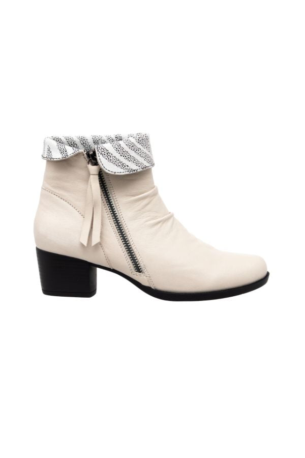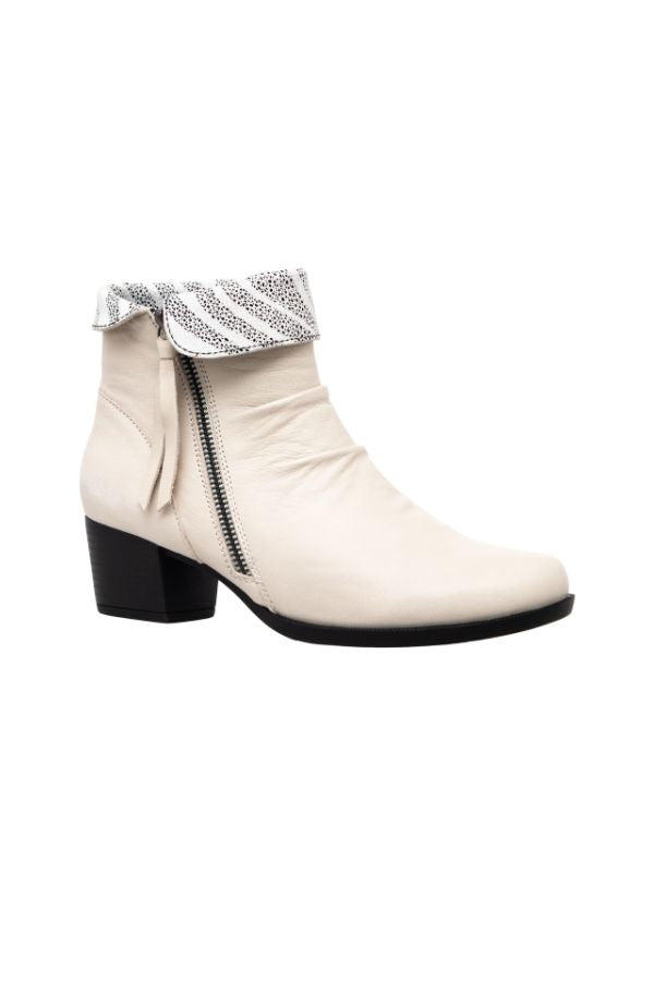 Light weight heeled ankle boot combining a twin zip fold down collar and latex padded sock. Can also be worn with collar up.