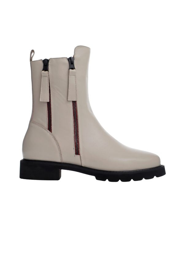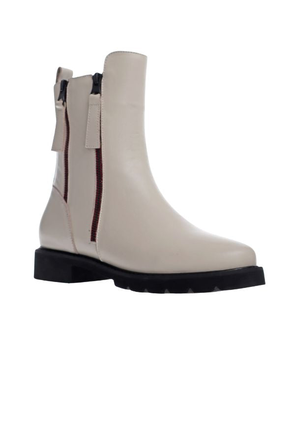 A mid-calf ankle boot featuring a light weight treaded sole, feature zips and an inside zip for entry. Combining cream leather for an everyday military inspired look.