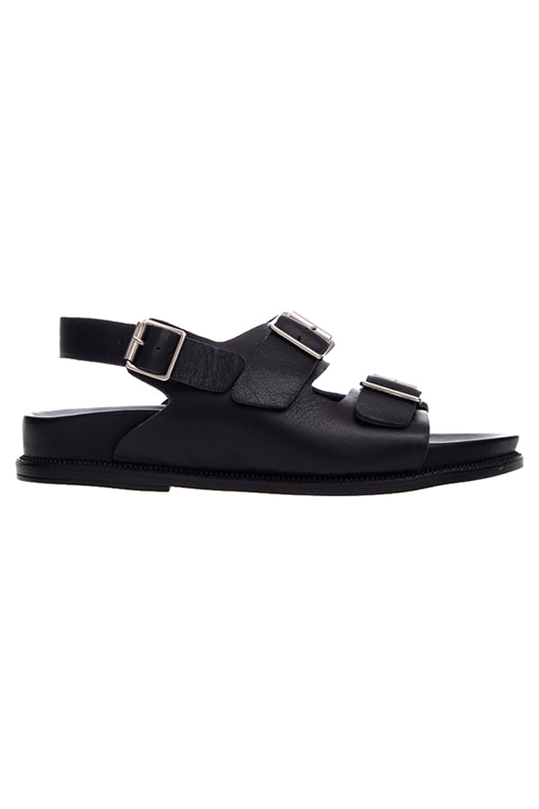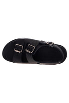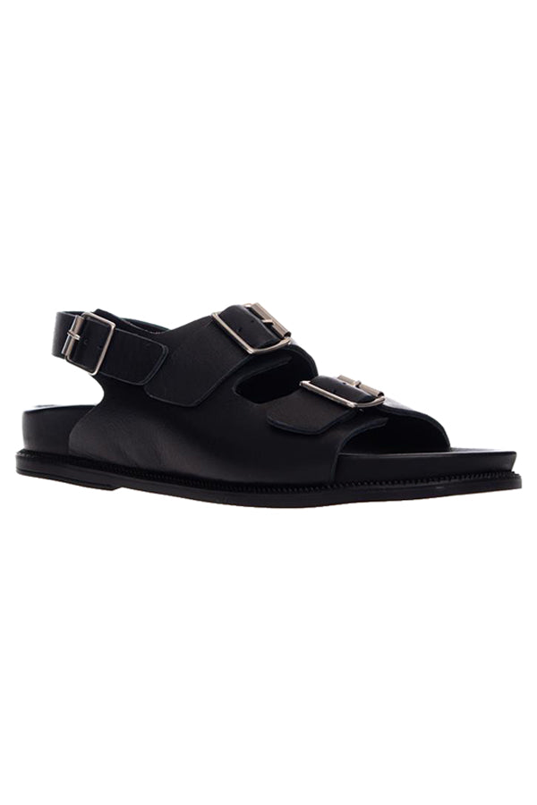 Featuring a leather bucket footbed design, internal sock padding and a three strapped adjustable upper design. Combining luxury black leather, dressy buckle trims and a sleek black sole.