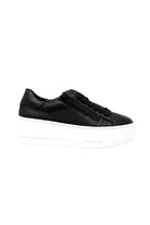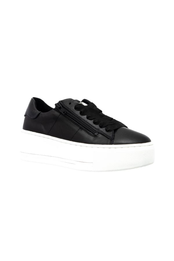 A platform sneaker with sleek style.  A classic sneaker upper in black leather. Featuring silver diamantes. Combining black laces and zip entry constructed on a durable light weight rubber white sole.