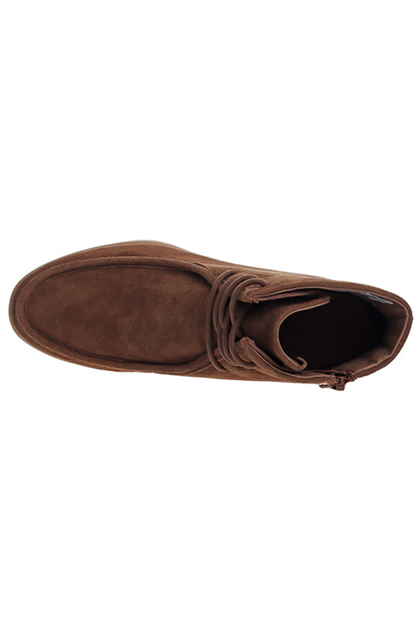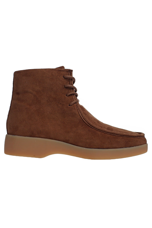 A modern spin on a traditional grass-hopper boot. Combining an apron front with wax laces and a rubber yard boot shaped sole. Featuring a soft khaki suede leathered upper.