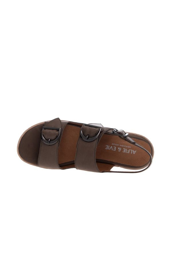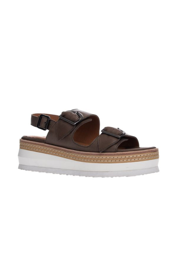 Interest in olive leather features a white flatform EVA/leather sole and a leather lined latex sock. Combining a triple buckled twin strapped upper and slingback design.
