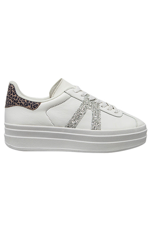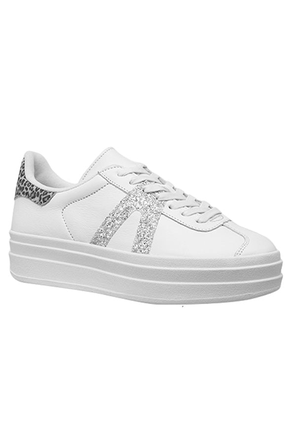 Constructed with a trending platform rubber sole this retro sneaker combines a white leathered upper, a silver glitter trim, animal leather heel tab and ultra padded removable memory foam sock.