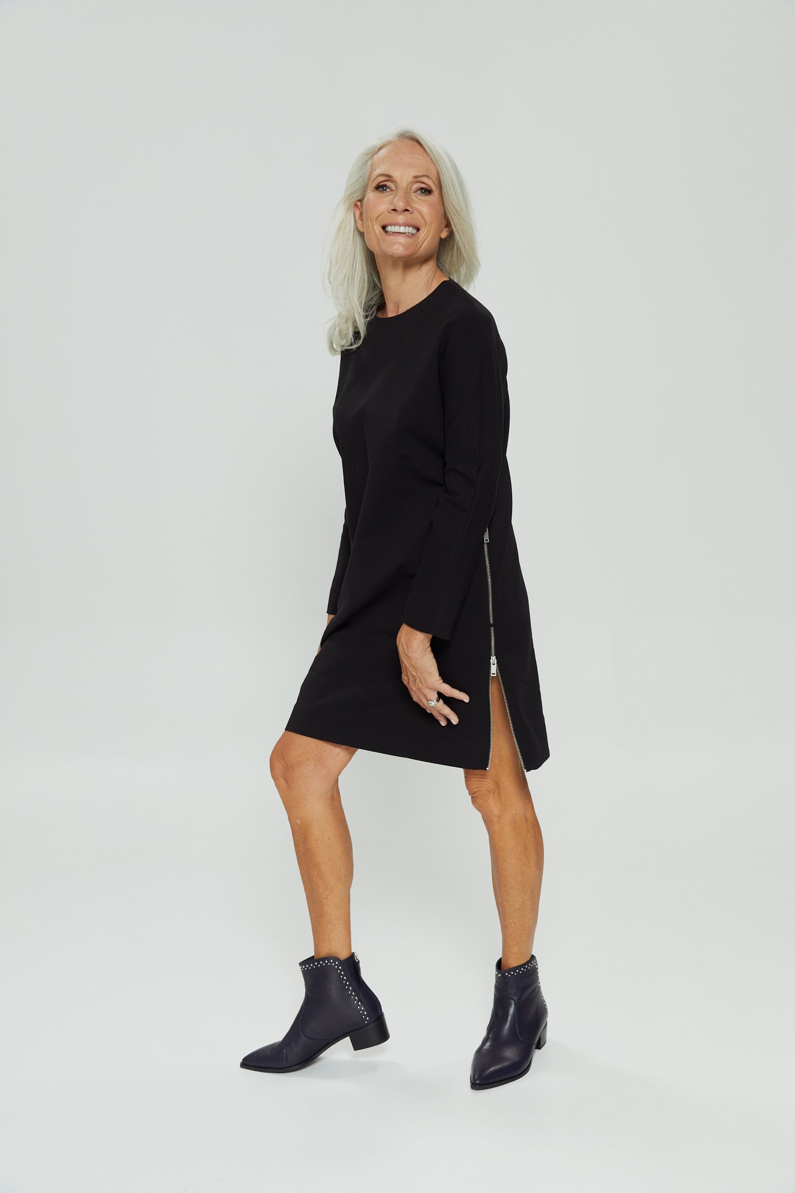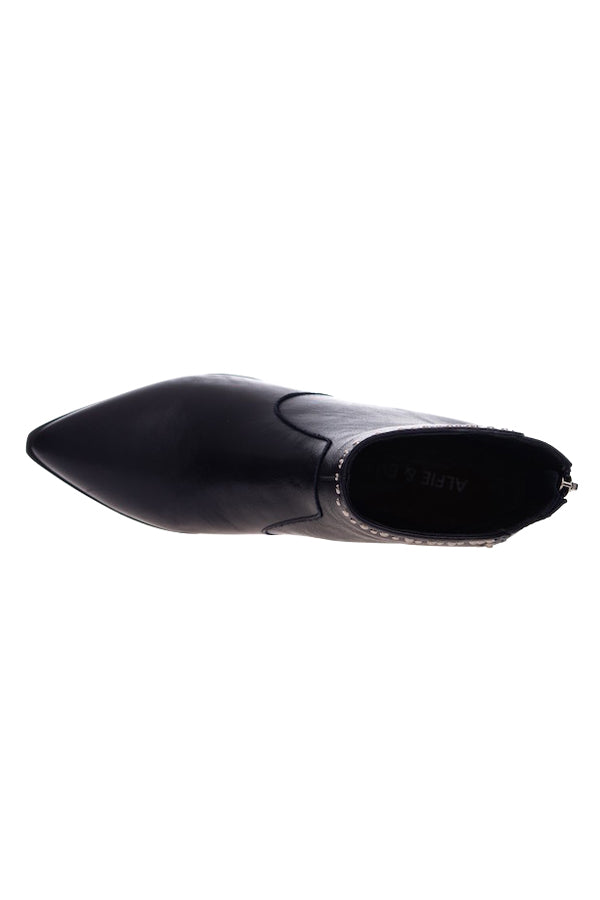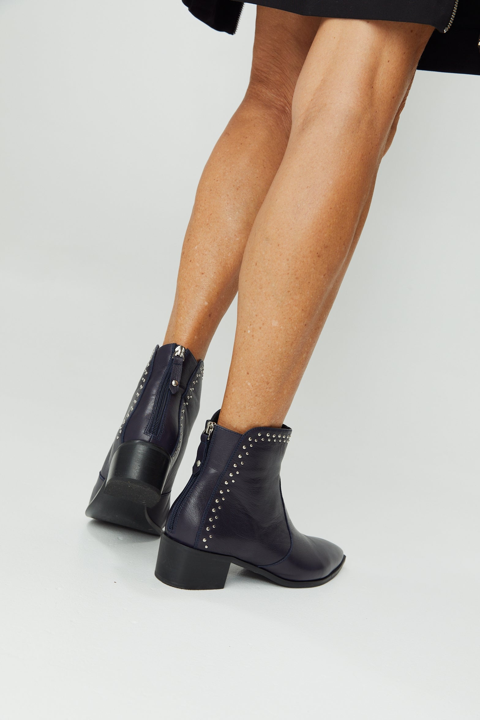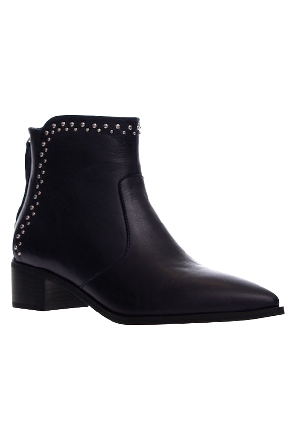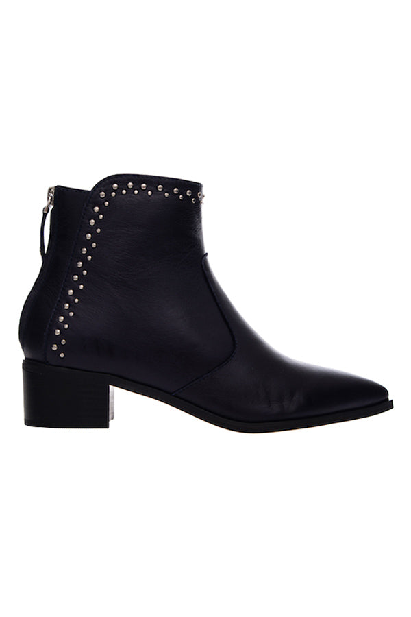 Featuring a black leather stacked heel and pointed toe design. Jones combines rich Navy leather, a latex padded sock, a featured pin stud design and a back zip for entry.