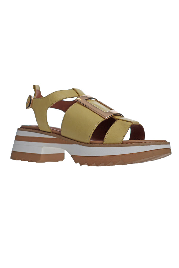 This platform sandal features a light-weight flex manmade sole with a latex lined leather sock. Combining a triple strapped upper with an adjustable slingback design. Bringing the style together with a feature square trim and a luxurious pale banana leathered upper with a matching black cut out sole.