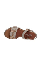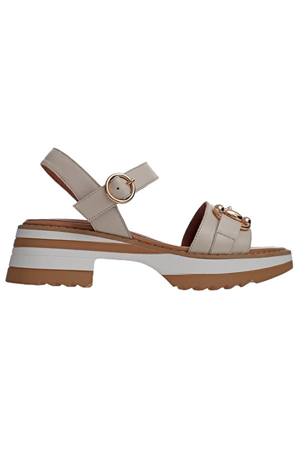 The Leighton platform sandal features a light-weight flex manmade sole with a latex lined leather sock. Combining a classic two strapped buckled upper with a horse bit feature chain. Complimenting a pure cream leathered upper with a natural and white striped cut out sole.