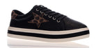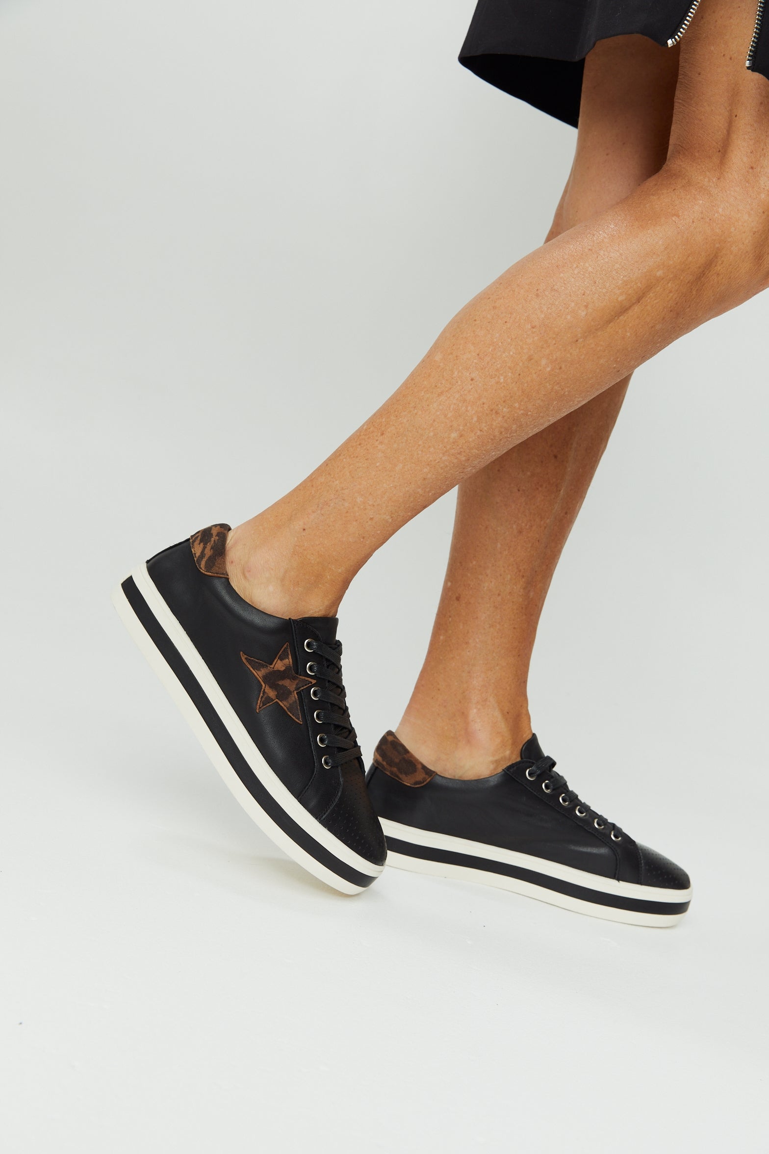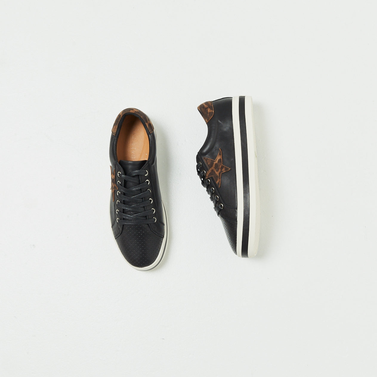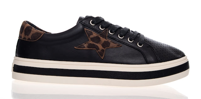 Our best-selling Pixie sneaker with a new spin on an all-time favourite. Combining luxe black leather and a brandy leopard star. Pixie features a star trimmed sneaker upper, soft Turkish leathers, a removable leather memory foam sock and a durable rubber platform sole.