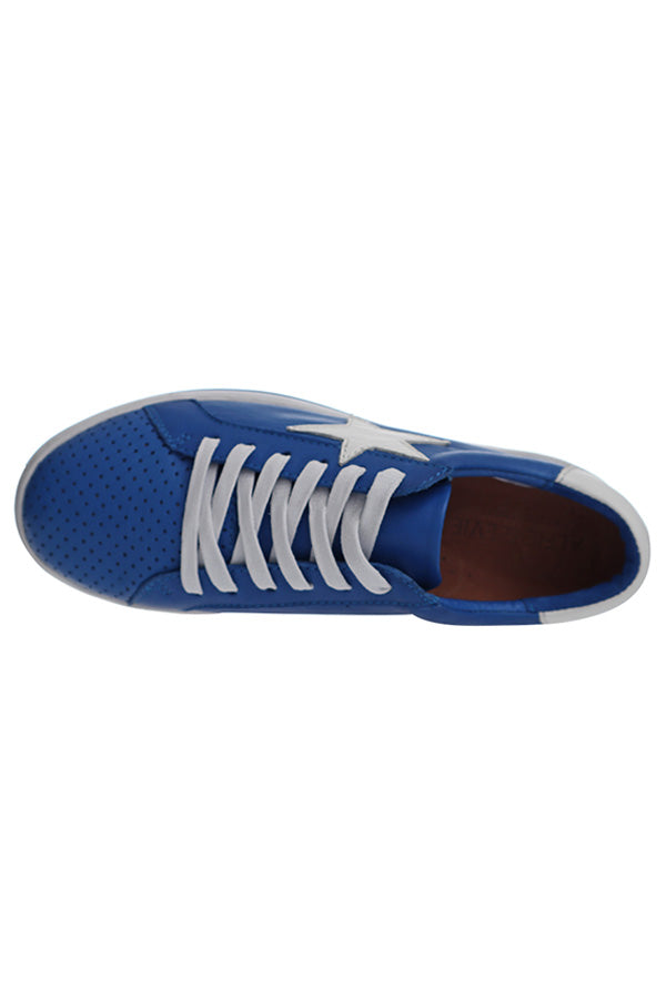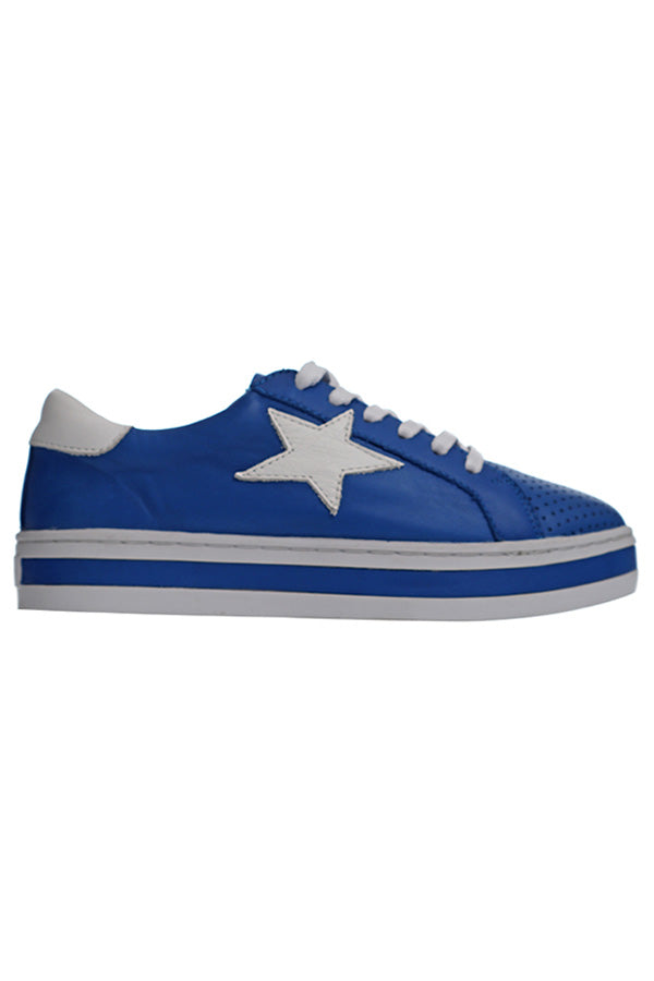 Our best-selling Pixie sneaker with a new bright bold combo of trending cobalt leather and a leather white star. Pixie features a star trimmed sneaker upper, soft Turkish leathers, a removable leather memory foam sock and a durable rubber platform sole.