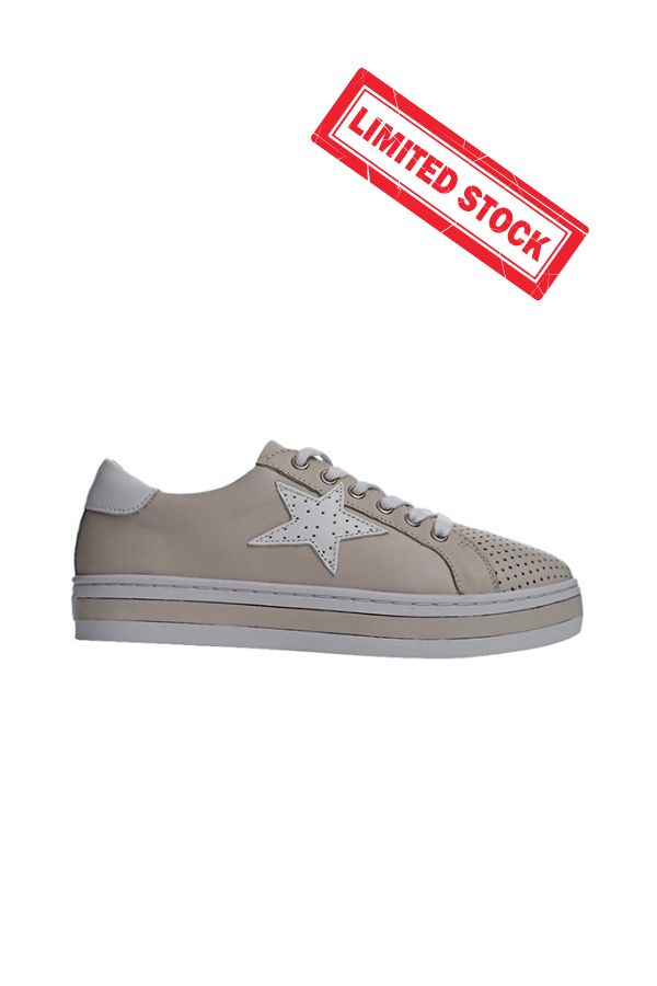 Our best-selling Pixie sneaker with a new classic combo of pale stone leather and a leather white star. Pixie features a star trimmed sneaker upper, soft Turkish leathers, a removable leather memory foam sock and a durable rubber platform sole.