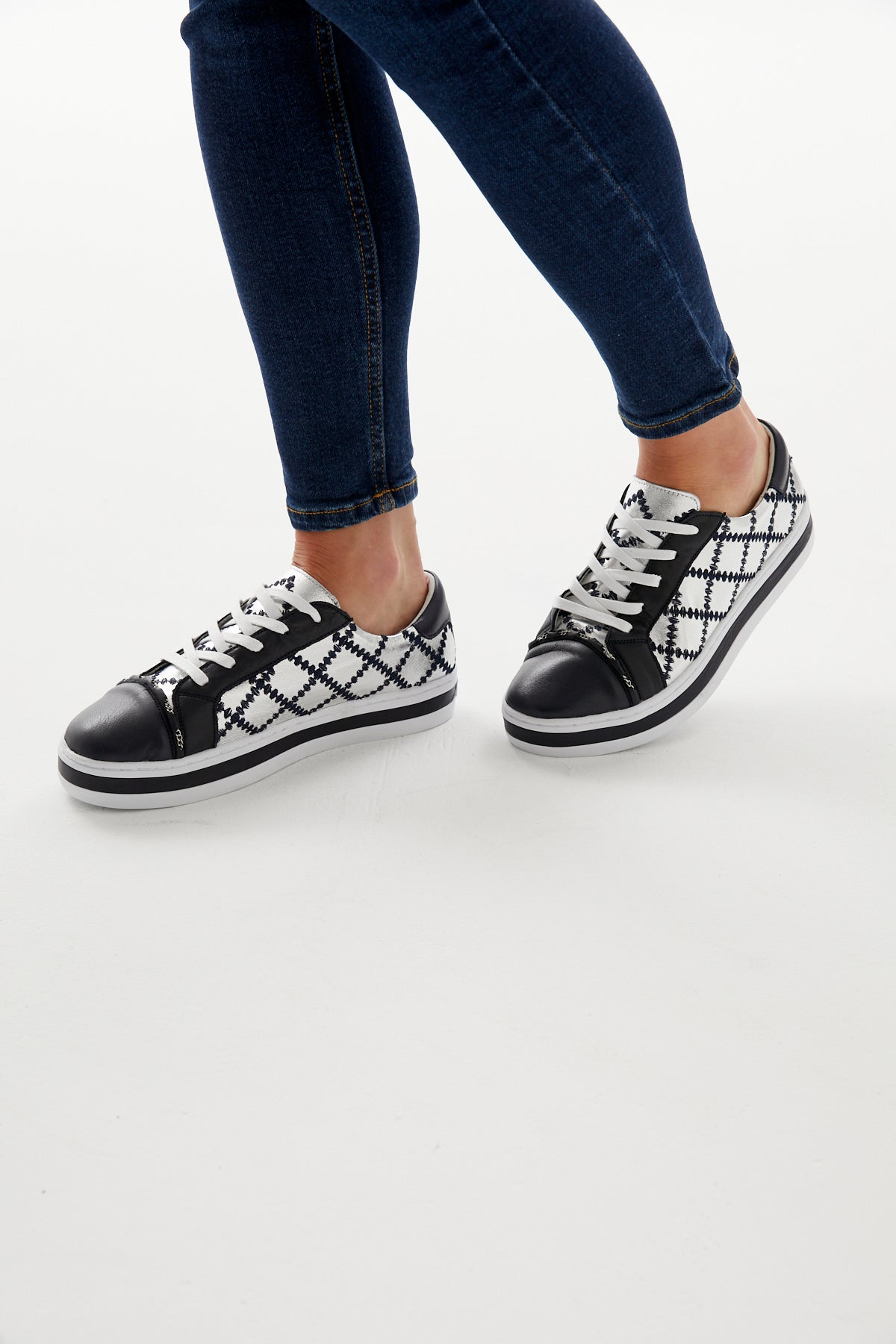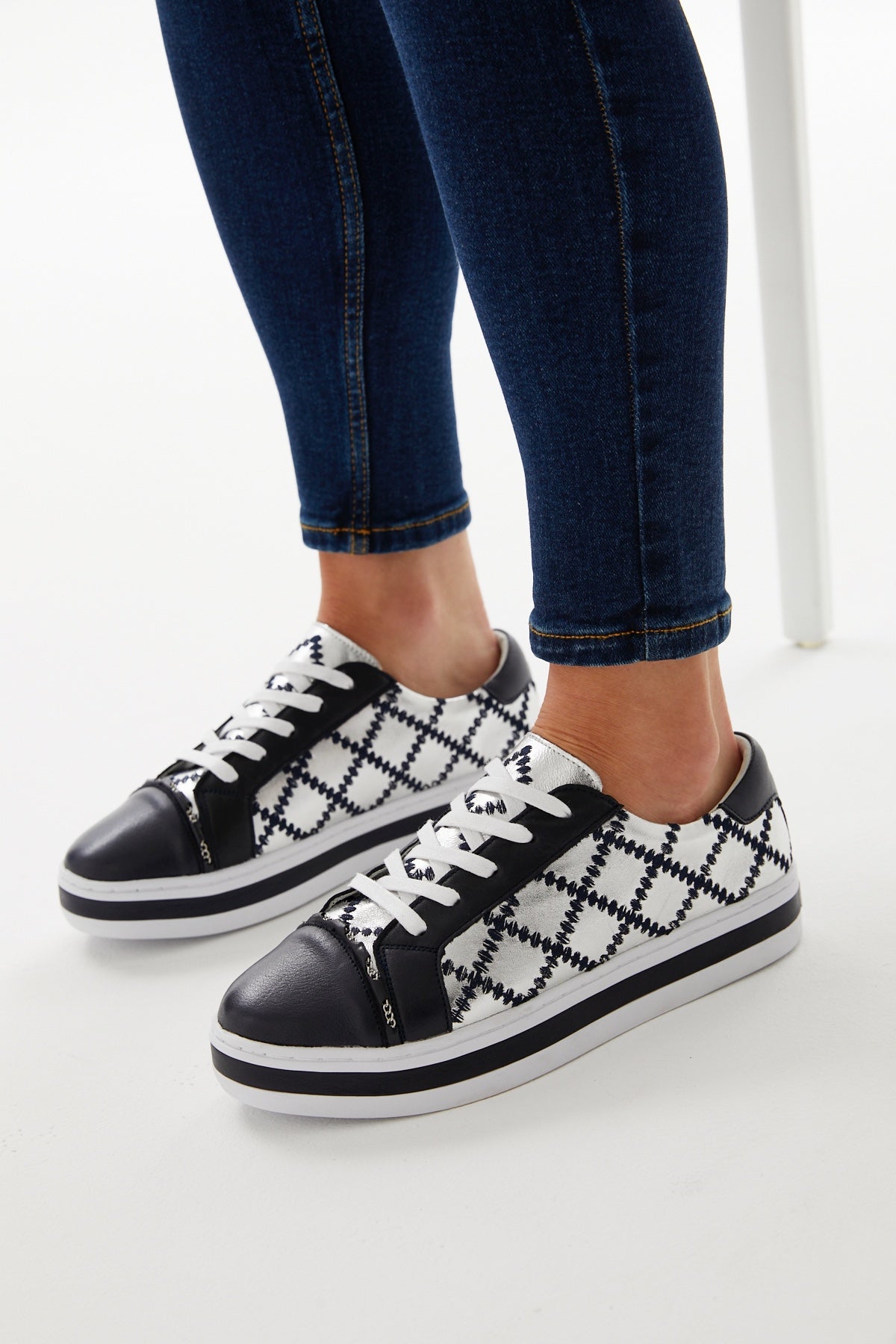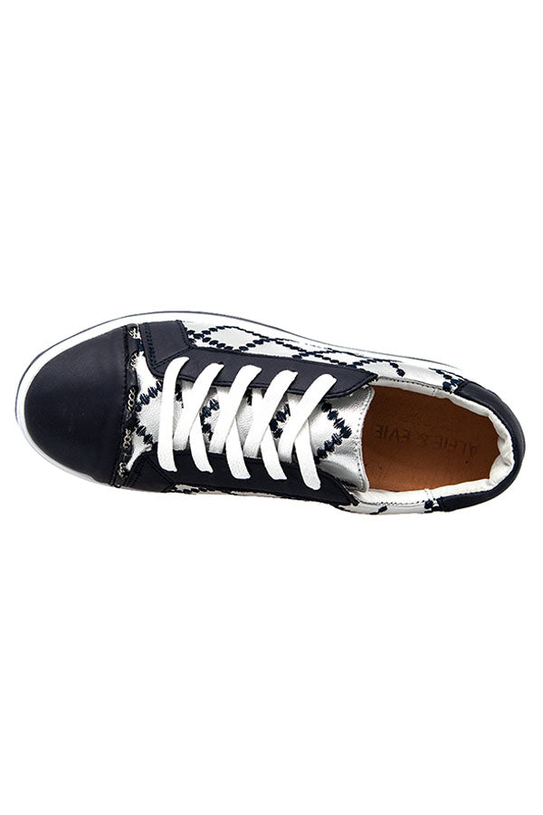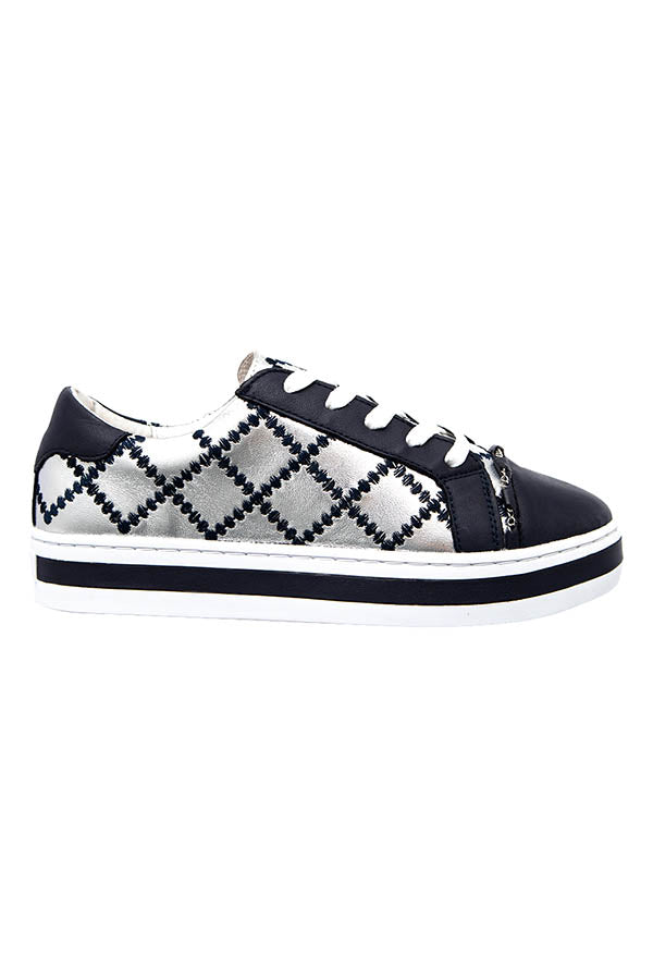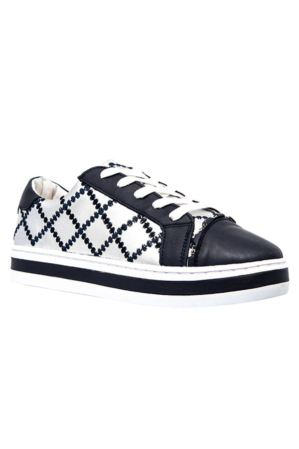 Our iconic quilted chained upper on our famous platform comfort sole. Constructed with a durable rubber sole and removable memory foam leather sock. Featuring a deep ocean and silver leathered upper with contrasting navy quilt stitching and a silver threaded chain across foot.