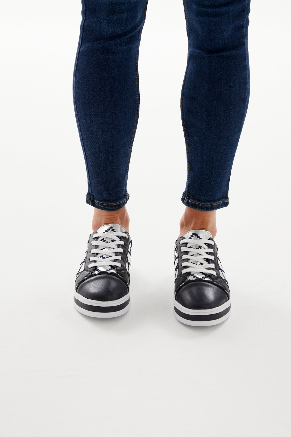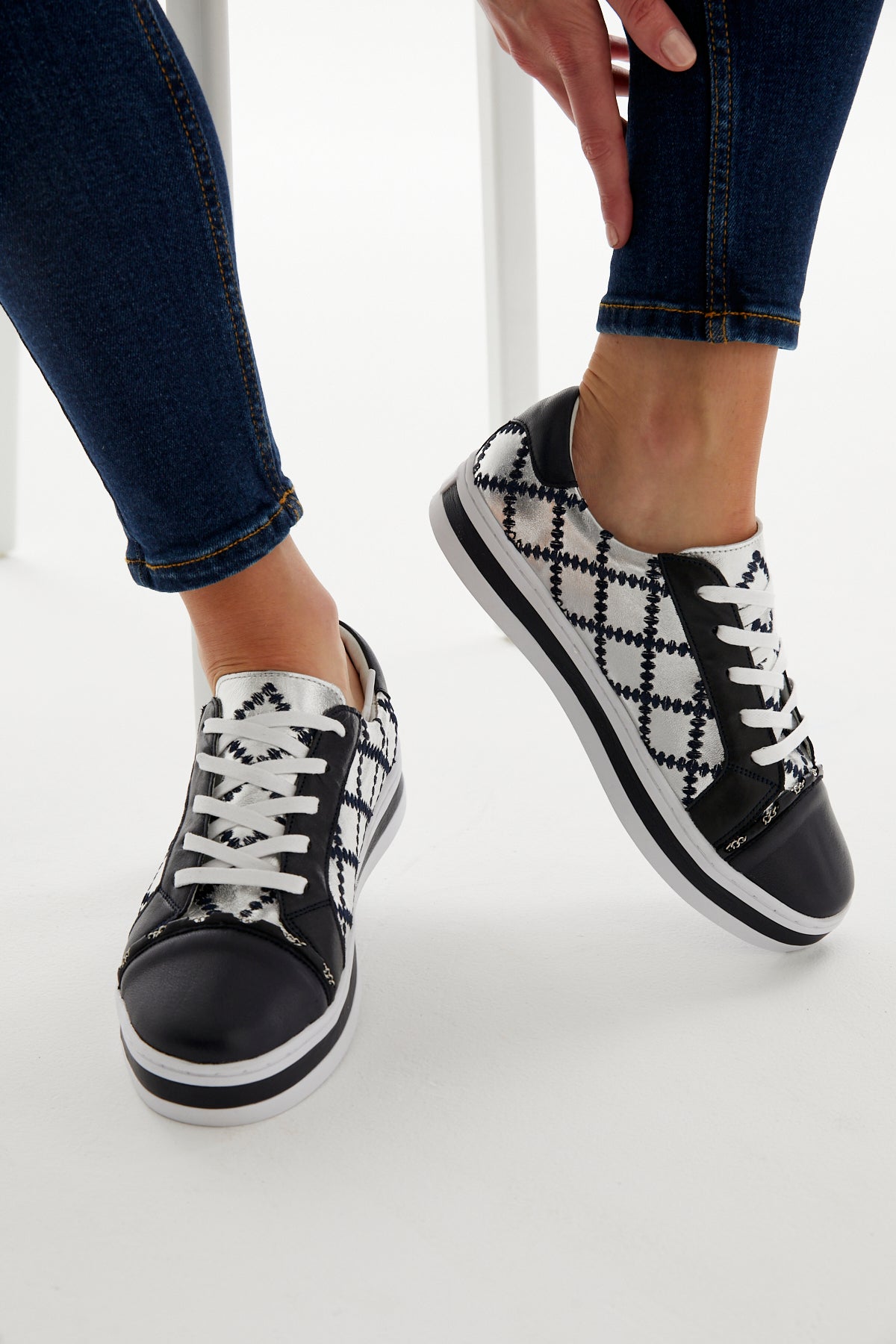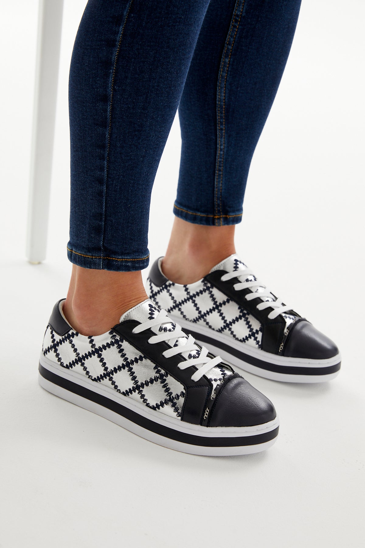 Our iconic quilted chained upper on our famous platform comfort sole. Constructed with a durable rubber sole and removable memory foam leather sock. Featuring a deep ocean and silver leathered upper with contrasting navy quilt stitching and a silver threaded chain across foot.