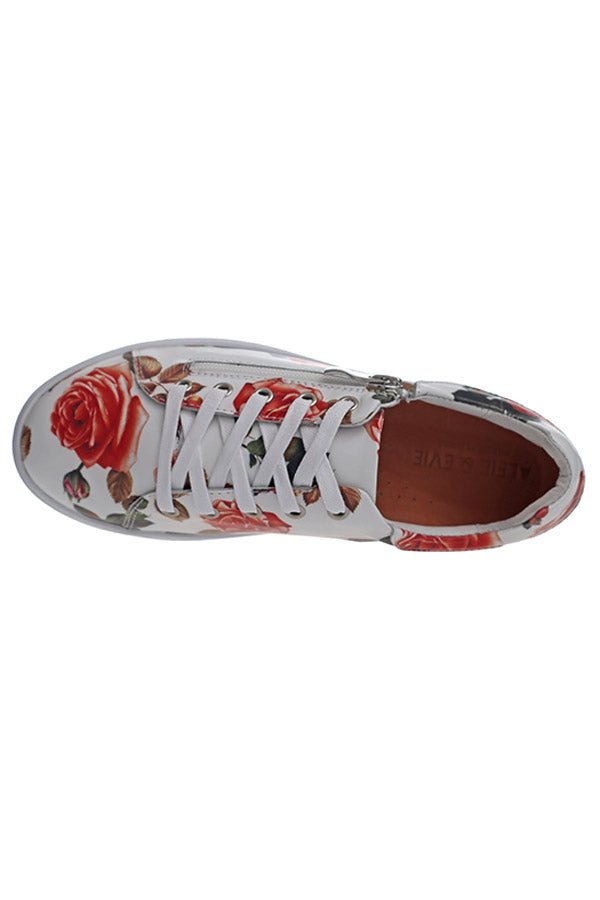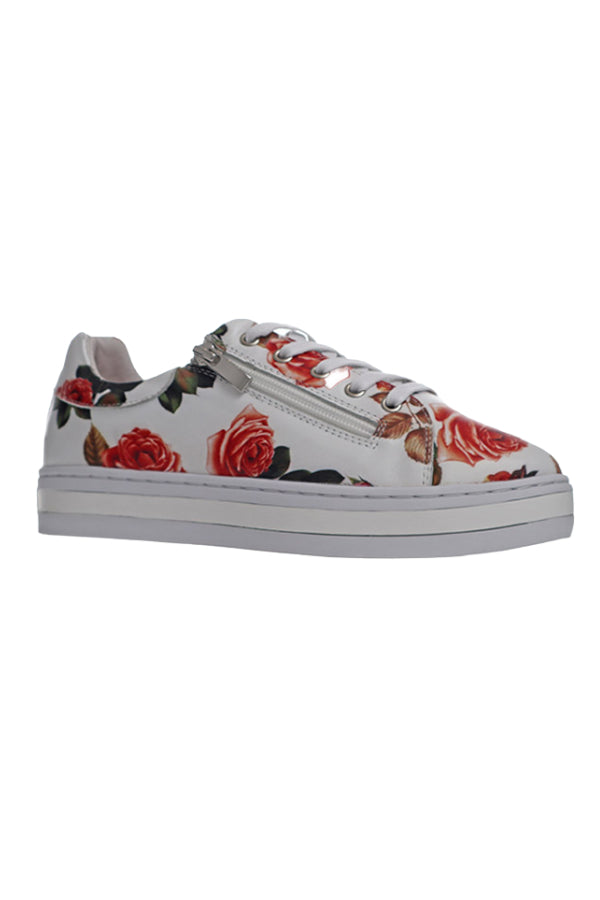 This floral white platform sneaker is the perfect trans-seasonal style. Posey floral adds a pop to any outfit with zip for easy entry. Featuring our signature platform rubber sole and removable memory foam sock. Featuring a soft white printed sneaker upper design with zip this sneaker is a must for your wardrobe.