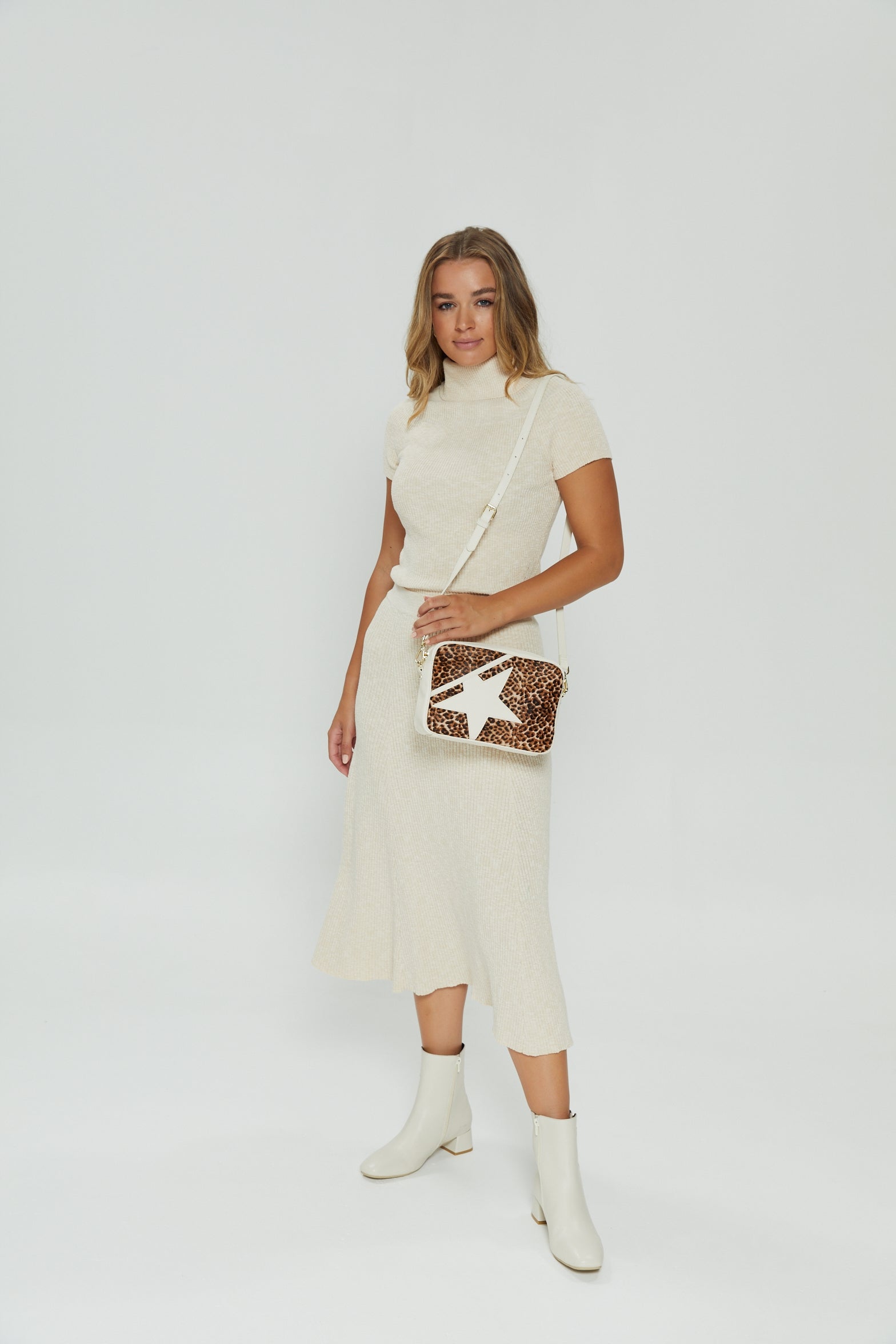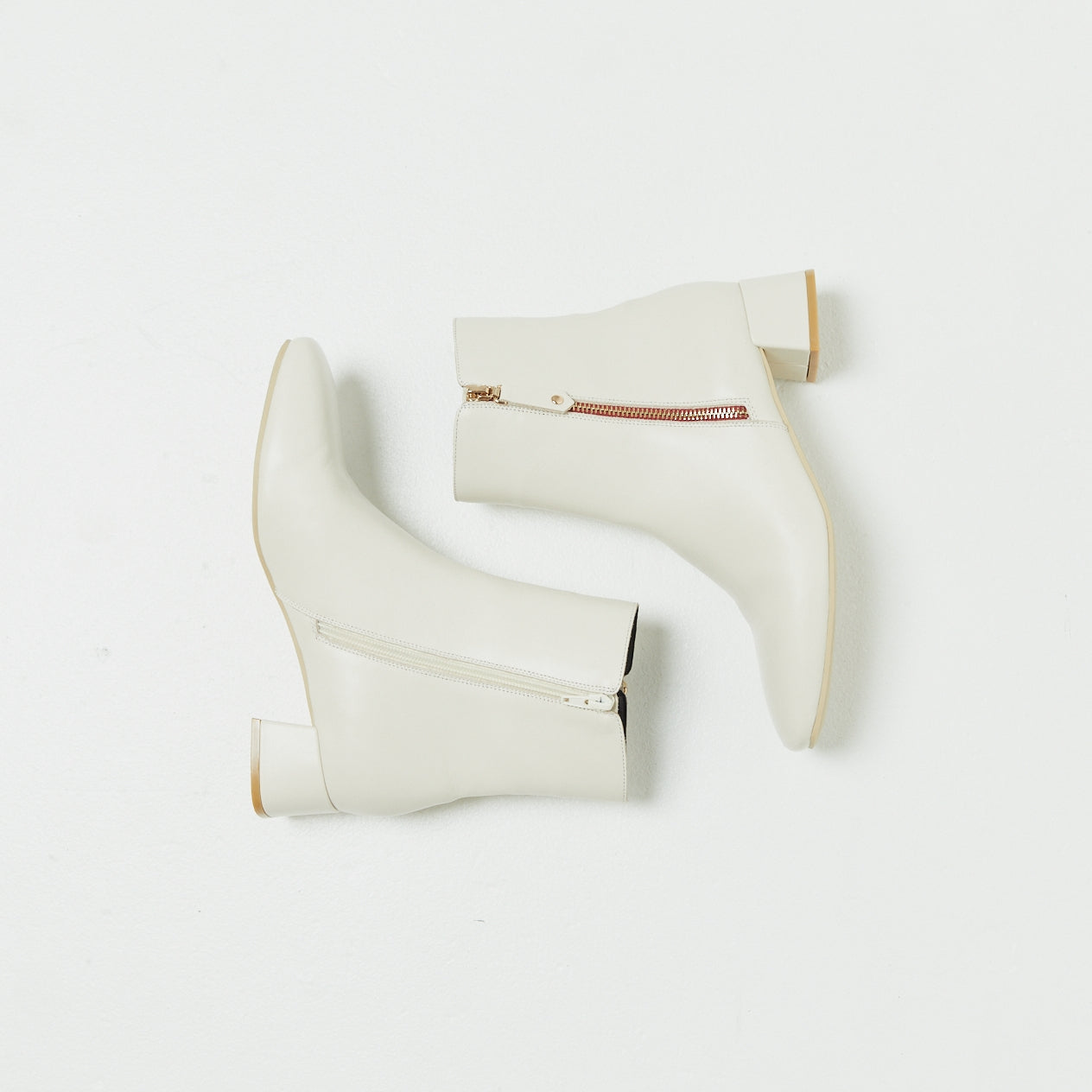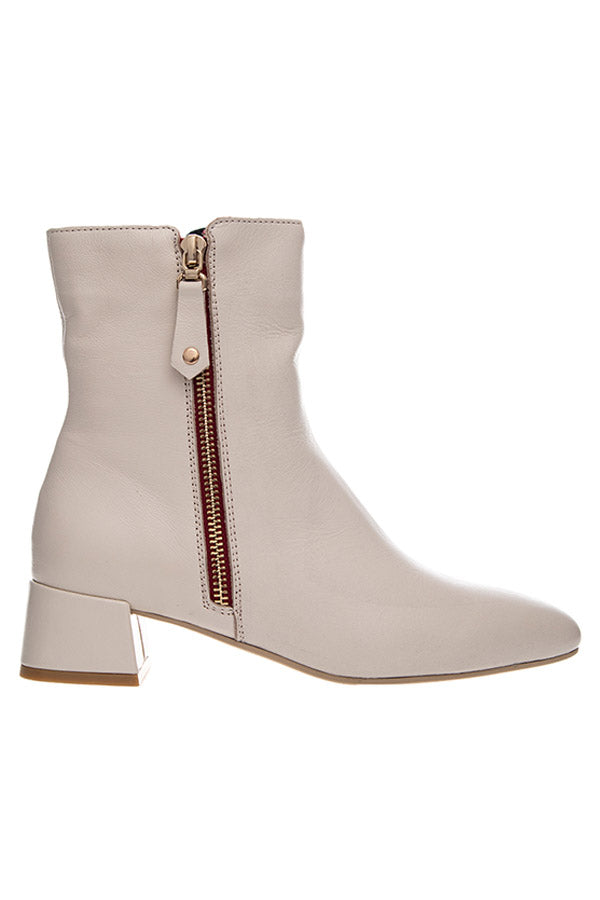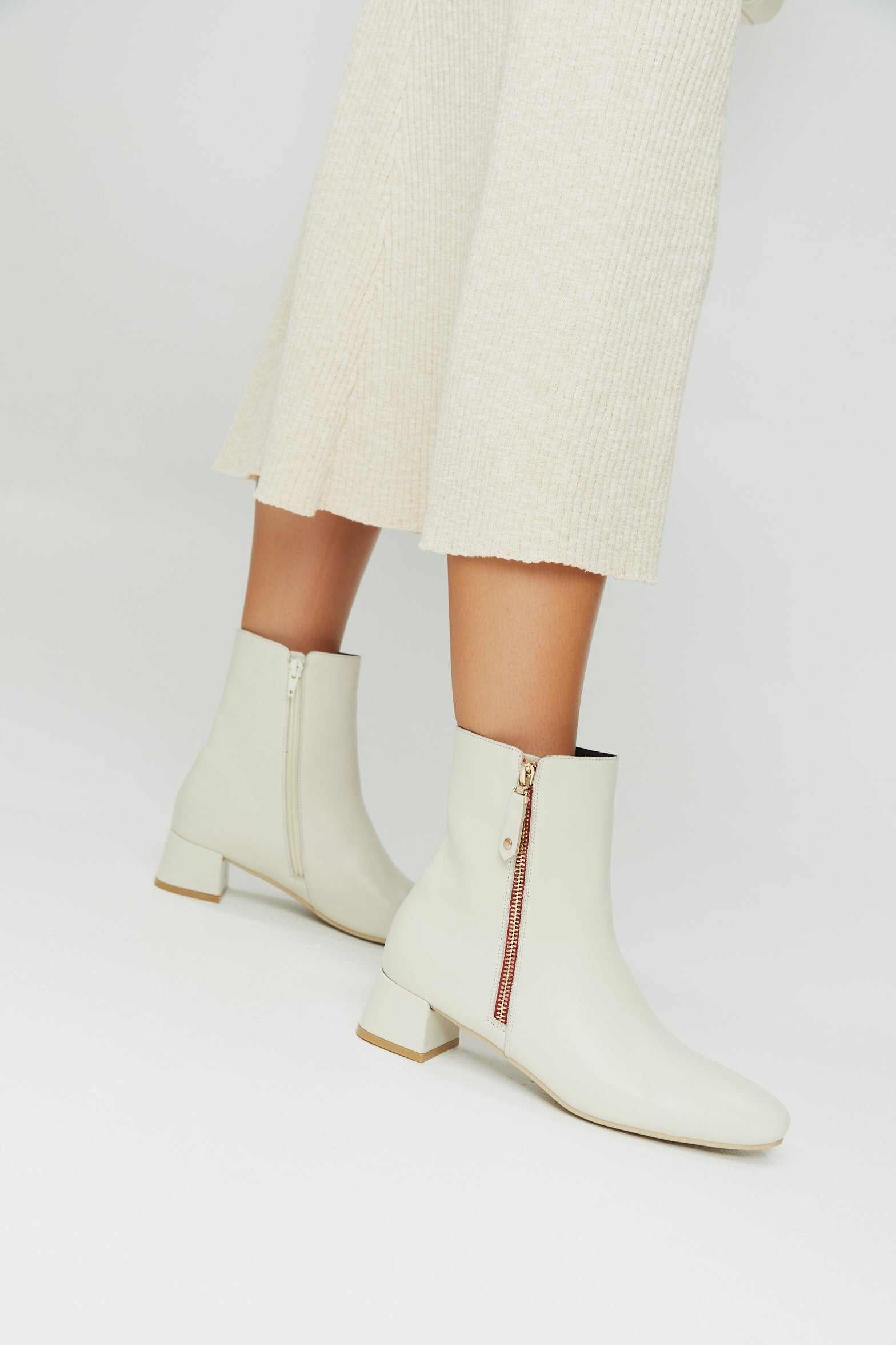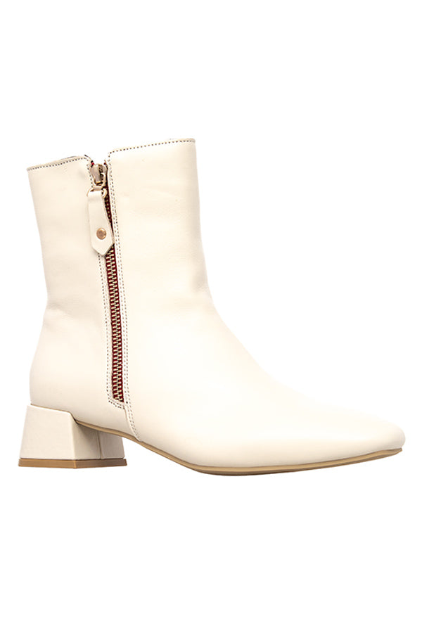 This 70’s inspired ankle boot combines a slight flared covered heel and a squared off toe. Featuring latex sock padding and an inside zip for entry. Bringing together statement Cream leather and an eye-catching metallic feature zip.