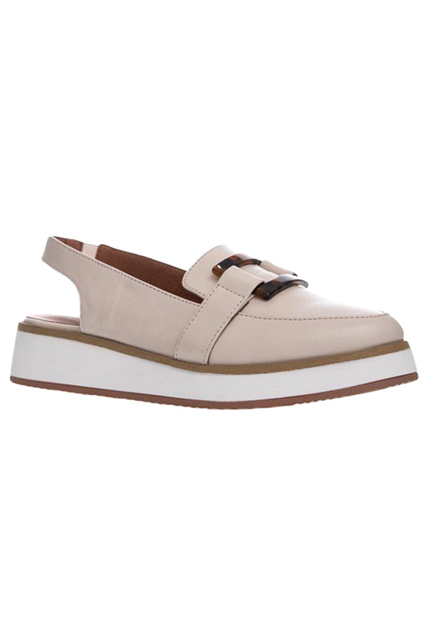 This light weight wedged platform loafer combines sleek smart style in one. Featuring soft cream leather, a latex lined leather sock and a slingback upper with a square tortoise shell buckle trim.