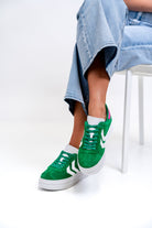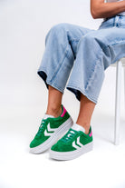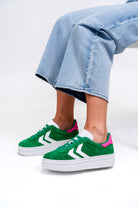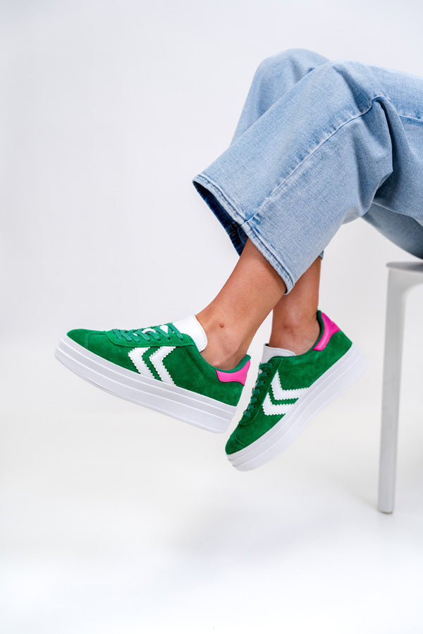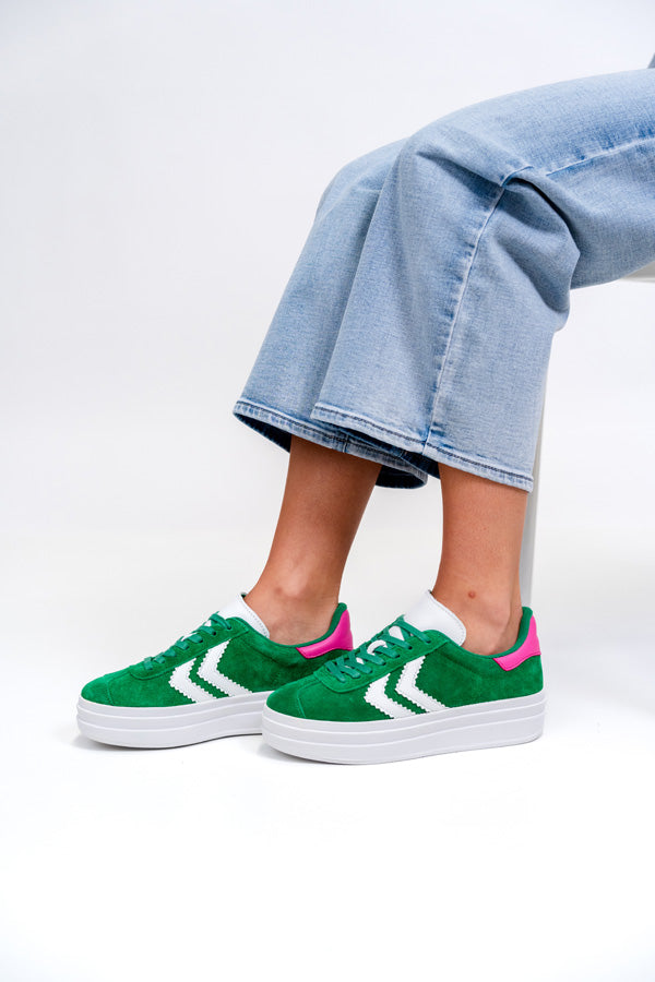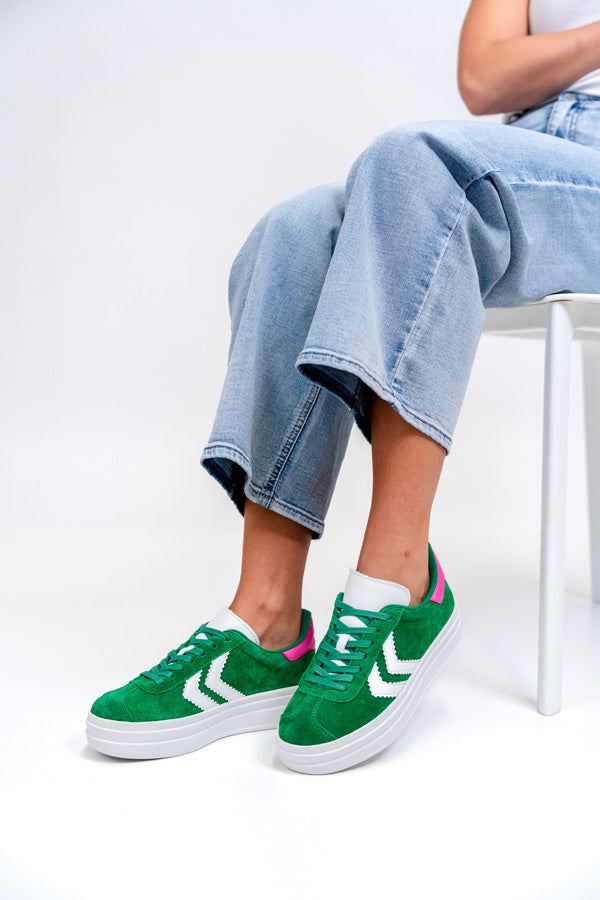Constructed with a trending platform rubber sole this retro sneaker combines a lush forest suede leathered upper, white arrow trims, a pink heel tab and ultra padded removable memory foam sock.