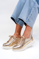 Crafted with a non-slip, light-weight flexible sole. Featuring a side zip lace up upper and latex stitched innersole. Combined with a gorgeous gold leathered upper, complimentary striped sole and striped laces. The perfect casual/dress hybrid.