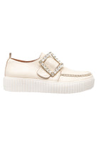A creeper rubber sole combining a removable innersole, Velcro strap, apron front design and feature diamante square metallic trim. Designed with a white coloured sole and a luxe cream leathered upper.