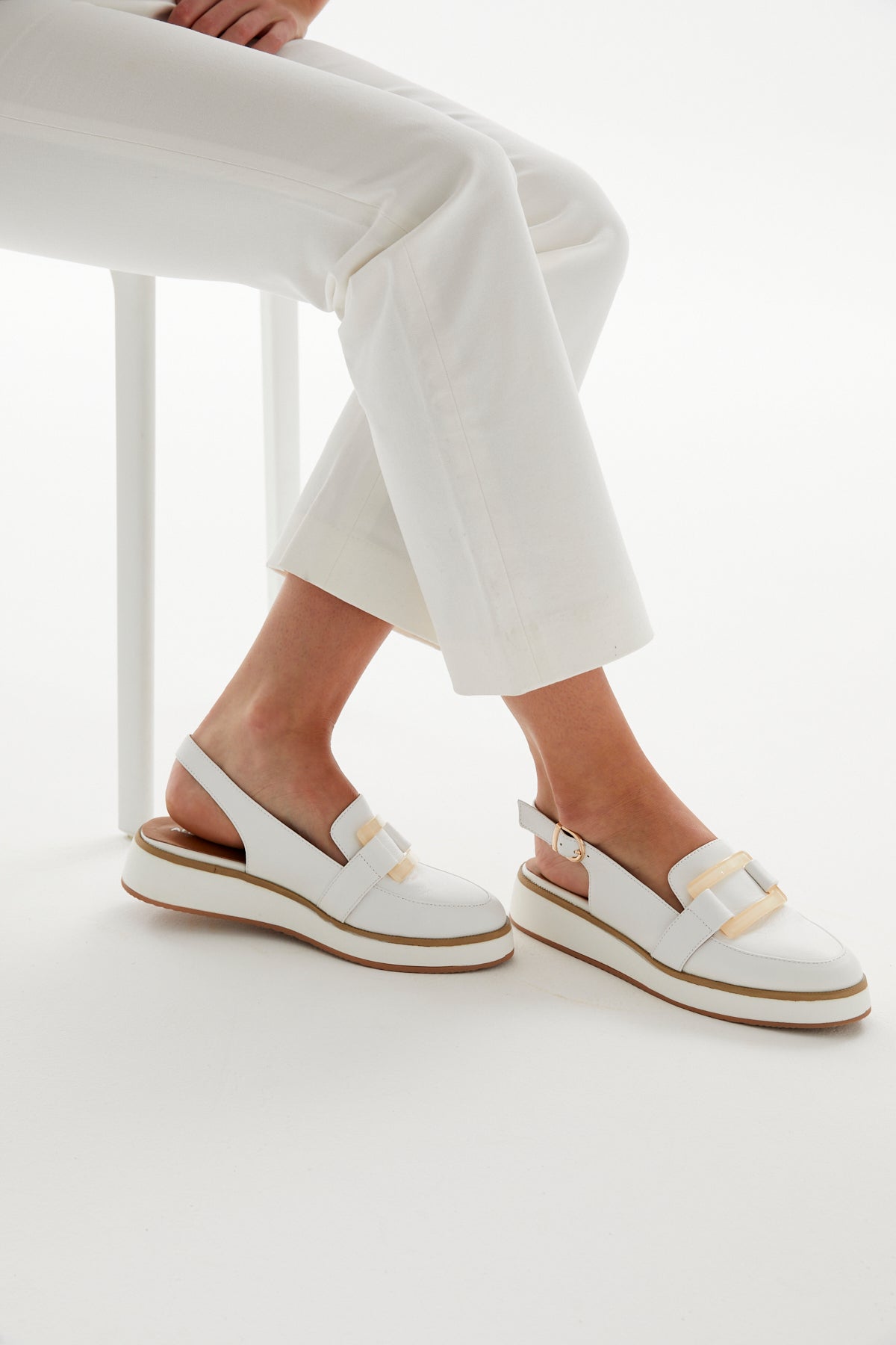 This light weight wedged platform loafer combines sleek smart style in one. Featuring classic white leather, a latex lined leather sock and a slingback upper with a square soft opaque buckle trim.