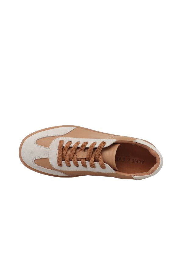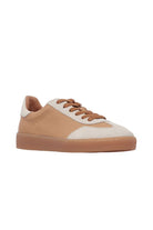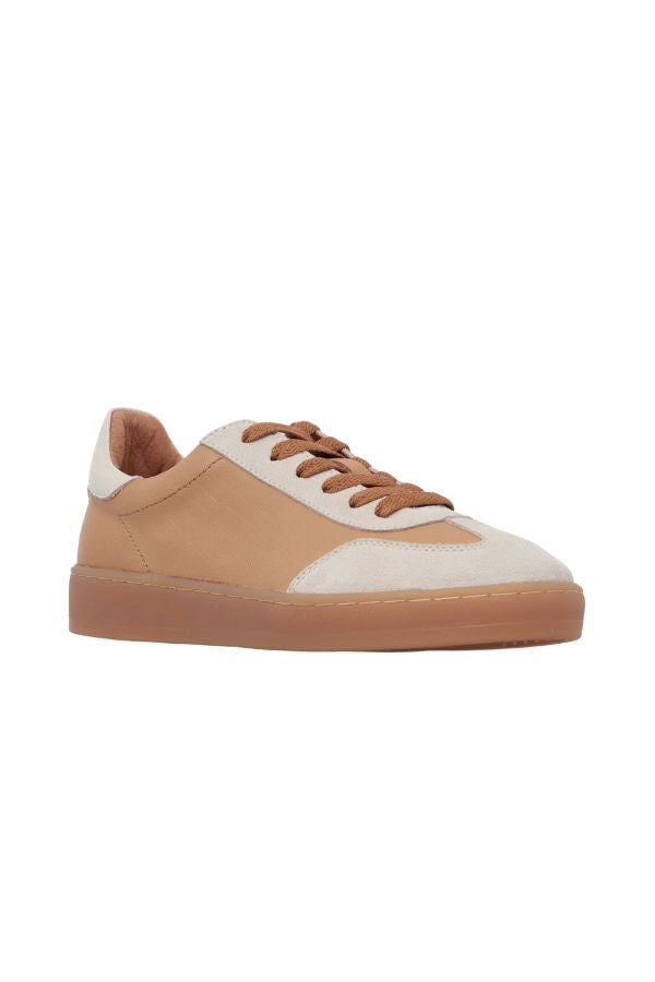 Minimal in profile this sneaker features a neutral-coloured rubber sole, luxurious cream suede trims and a soft camel leather upper. A feminine spin on a retro classic sneaker.