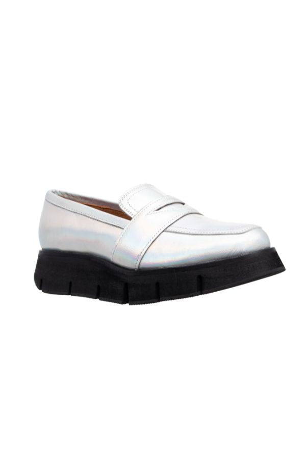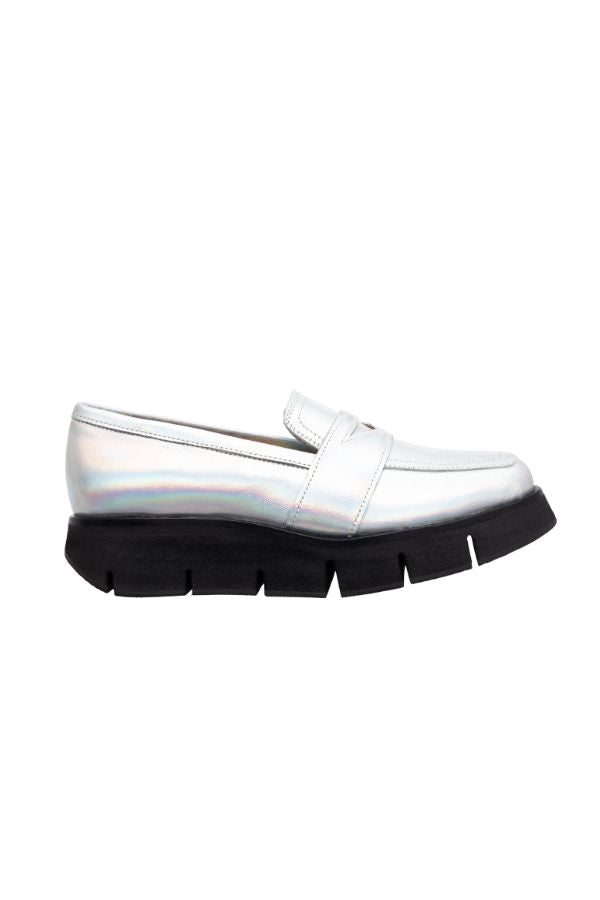 Constructed with a light-weight EVA platform wedge with intermittent splits in the sole to achieve incredible flexibility. Featuring a classic loafer silhouette with an apron front design.